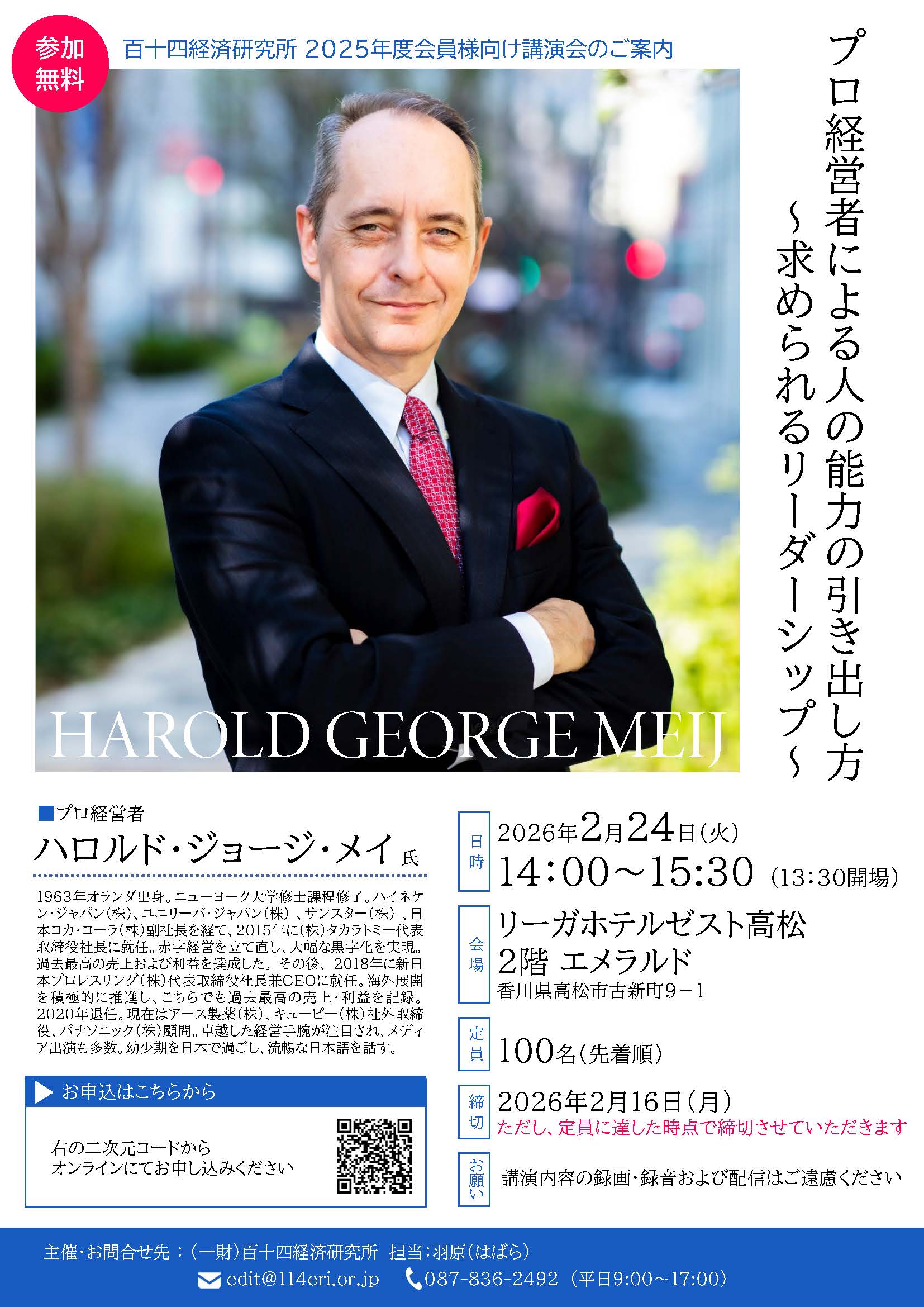 グローバル経営の最前線で活躍してきたメイ氏が、「人の能力の引き出し方」や「これからの時代に求められるリーダーシップ」について、自身の経験をもとに語ります。変化の激しい現代において、人材の力を最大限に活かすためのヒントが詰まった内容です。詳細は下のチラシをクリックしてご覧ください。「調査月報」1月号でもご案内を掲載しています。参加は無料です。会員の皆様のご参加をお待ちしています。